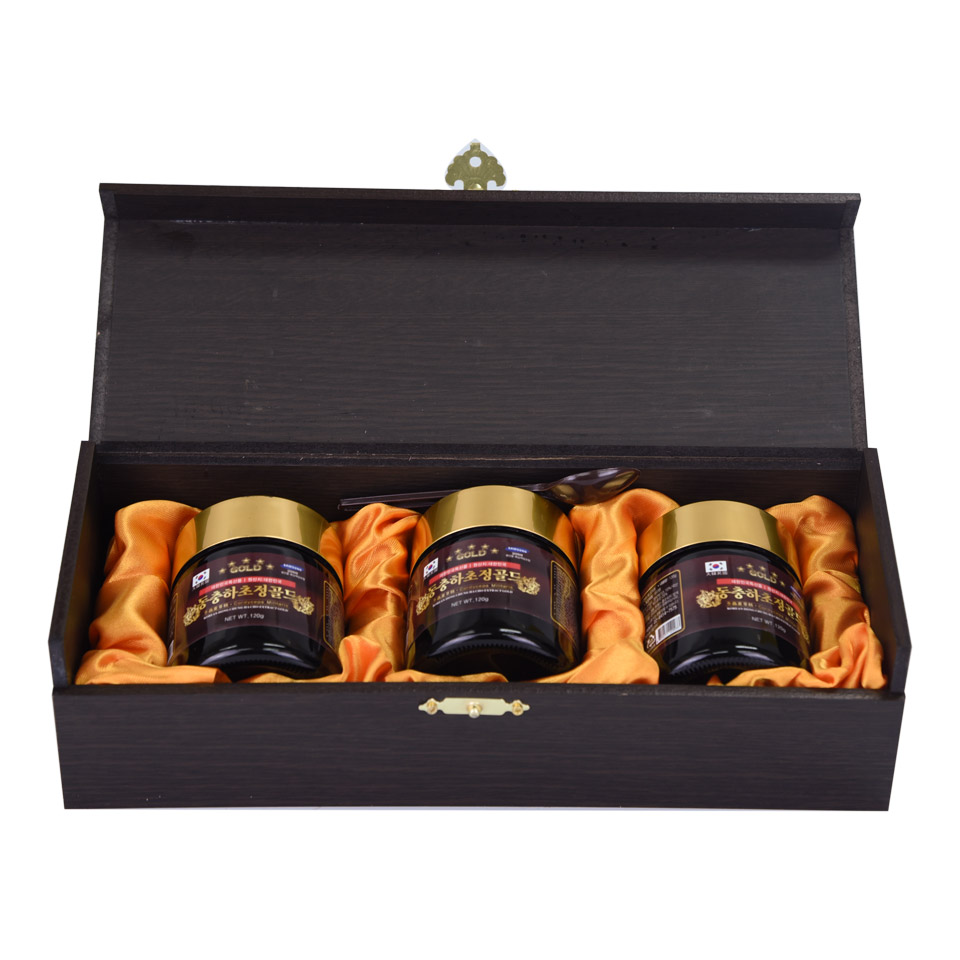Cao đông trùng hạ thảo Gold Hàn Quốc hộp 3 lọ x 120 gr là dòng sản phẩm được chế biến bởi nguyên liệu chính là đông trùng hạ thảo Hàn Quốc. Những tinh chất trong đông trùng hạ thảo sẽ được chế biến và cô đặc thành dạng cao, tiện lợi cho việc sử dụng và hấp thụ của cơ thể.