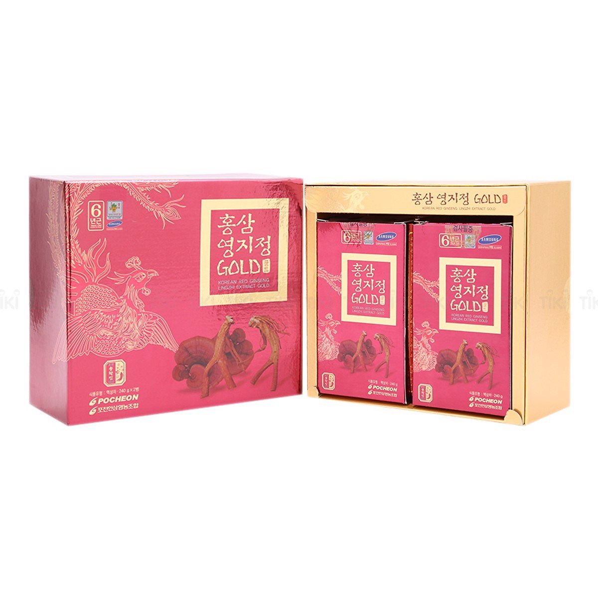 Cao hồng sâm Pocheon linh chi được đóng gói theo quy cách hộp 2 lọ có trọng lượng mỗi lọ 240gr, với thiết kế thanh lịch và không kém phần sang trọng, vỏ hộp thể hiện đầy đủ những thông tin cần thiết giúp người dùng biết về nguồn gốc xuất xứ của sản phẩm.
